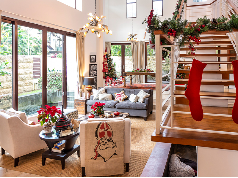 Our banister now has greenery that I bought at Kinex Mall, a great place for picking up fake trees, wreaths, greenery and lights. In the US, we got lots of cards from our friends with photos of their families and stories of their past year. Here we tend to get email cards so I now put our own family cards up attached to the greenery; it’s a fun way to track how the kids have grown from Christmas to Christmas. My favourite is a photo of my kids on Santa’s lap: my daughter is beaming from ear to ear and my son is hysterical in tears.