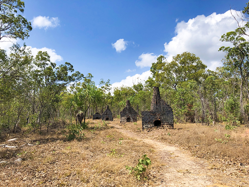 Back at the Cobourg Peninsula, we spent a morning exploring Port Essington with skipper Travis. We sailed to Victoria Settlement, a failed British outpost. With the aim to be the next major trading post, the town faced many setbacks including a cyclone and a malaria outbreak, and was eventually abandoned after just 11 years. As we walked around the ruins, Damon pointed out structures of the town that remained, such as the hospital and married quarters, with only their chimneys left standing.