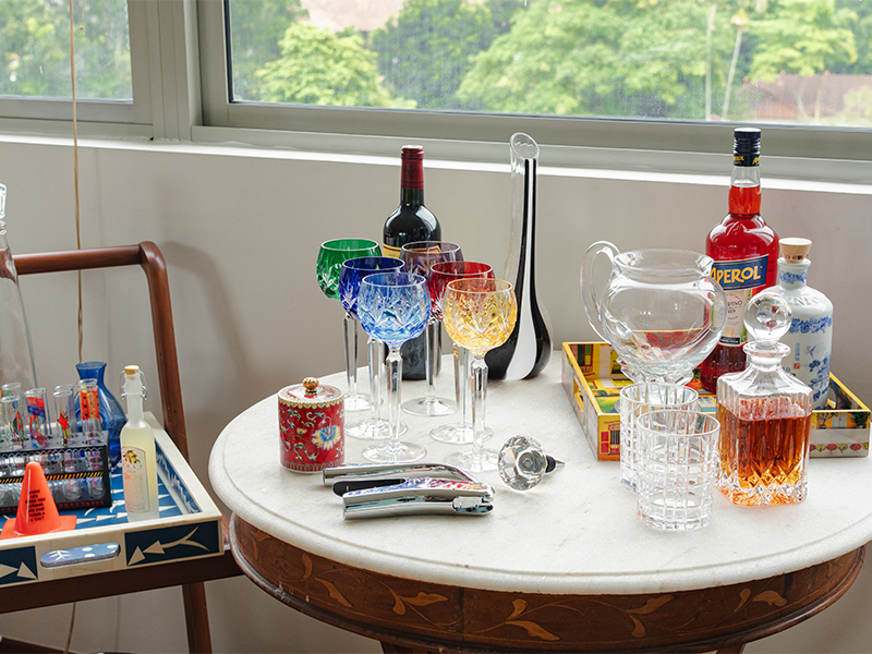 I would have loved to decorate my home in a Scandinavian style, but it wasn’t a match for our artwork or artefacts, so instead we chose to follow our gut and emotions. One can really feel cosy and “at home” here – every piece has a story and we love that! One of my favourites is the tequila lab we designed back in 2000. It’s a set of 12 hand-painted test tubes sitting in a stand that can be used as shot glasses. Our colourful wine glasses come from Prague and one of our water jugs is a Rosenthal antique that we received as a wedding gift.