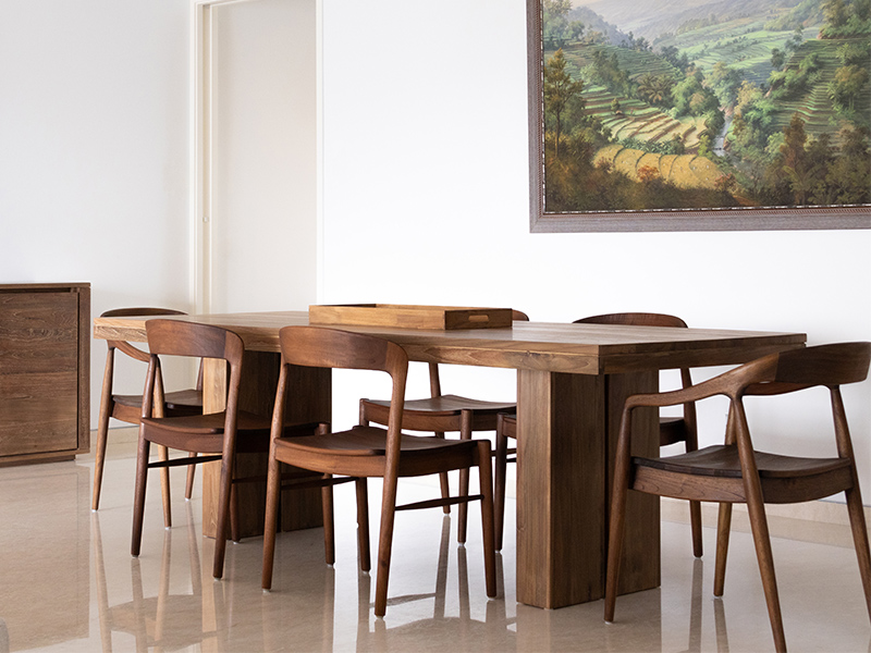 - Crafted from solid teak wood, the Mono 1.5m Dining Table adapts well in small living spaces, suitable as both a dining and working space. The shallow depth of the table is ideal for intimate dinner conversations while being space-saving. Its long proportion accommodates up to six diners.
