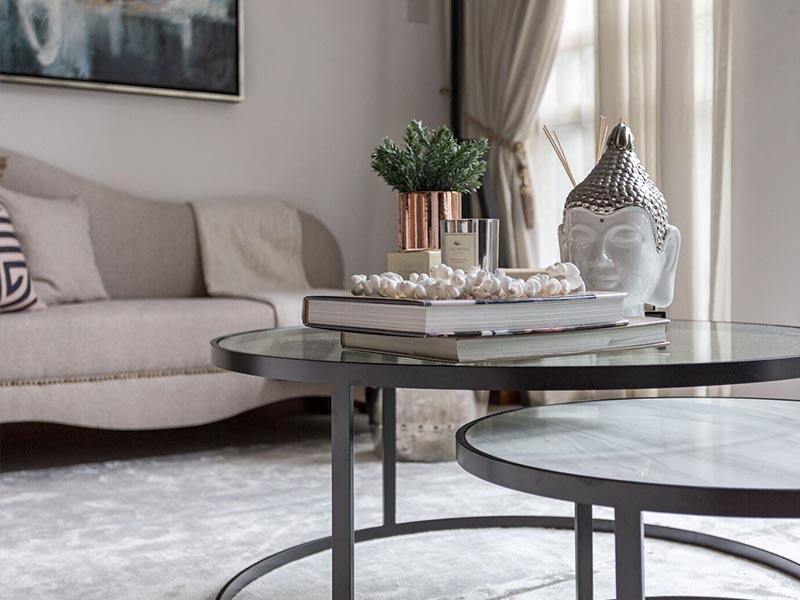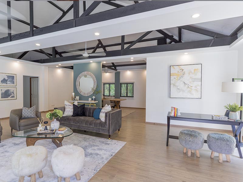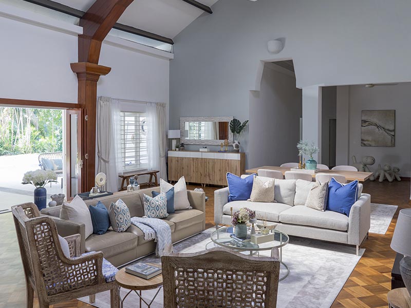 This was one of our earliest black-and-white house makeovers. The soothing colour palette of taupe, greys, and blues was inspired by the surrounding nature. We also wanted to draw attention to the majestic height of the home; so we used rattan birdcage pendant lamps to draw the eye upwards. Fun fact: This home was styled when the homeowners were away from the country!