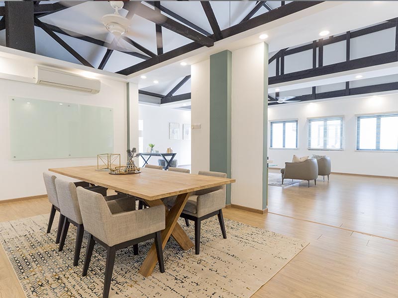 We worked with these homeowners to create both a cosy home and an office space complete with a meeting room in the annexe of a single storey bungalow. We designed the office from scratch so that it would be a functional but stylish extension of the house, and intentionally painted the exposed beams in the raised roof to honour the roots of the home.