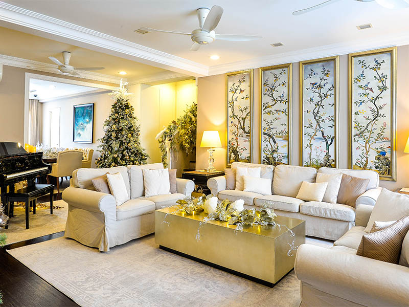 “My middle name is Christmas,” laughs Amelia Ann as she stands bathed in the warm light from the thousands of festive lights dotting her living room. “In fact, I like Christmas so much that this house was built for it. When we designed the apartment, I made them put in a fake mantle so I’d have somewhere to put a swag.”