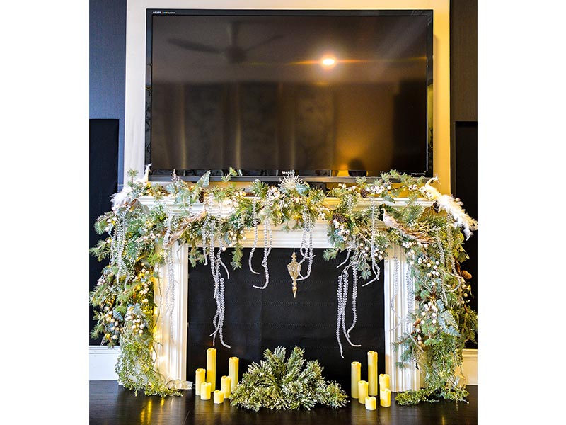 Amelia mixes her own essential oils, another passion of hers. So, to get her in the mood, she creates a special holiday scent that floods the home. Then she gets busy, decorating everything herself, taking about a week to trim the 2,000-square-foot apartment. Two taller pieces in her home are topped with asymmetrical decorations she builds one piece at a time. “Asymmetrical is important because you don’t want your home to look like Lego, though the mantle should be balanced. When I do the taller pieces, I go up and down the ladder a lot. I look at what’s working and what isn’t and climb up again. I end up doing a yoga pose of sorts on top of the ladder to get just the look I want.”