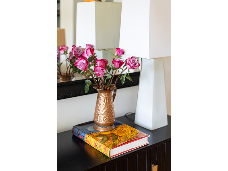 I love the sofa and the life-size mirrors in the house; they bring a lot of nature inside through reflection. The Himalayas painting shows snow and stupas in the background and is one of my favourites. I’ve placed a huge vase of dried flowers next to it – these are symbolic of a lively, colourful and beautiful childhood that’s freshly preserved in my memories. I enjoy seeing it every day.
