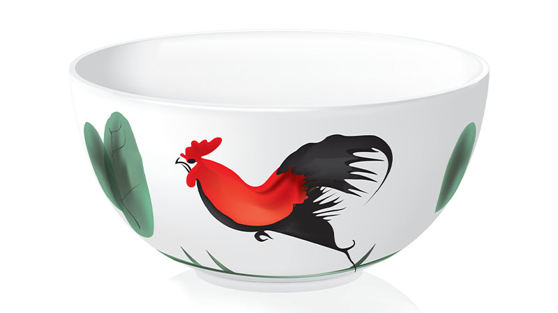 Rooster-design bowls and plates are used to serve noodles and other dishes not only here but in Malaysia, Indonesia, Thailand and Hong Kong. You don’t come across them too often today, and if you do it’s usually a plastic version rather than the traditional hand-painted ceramic variety. Most of the original bowls were manufactured by the Hakka community in Thailand – in particular, Lampang Province – though the design is likely older, from China’s Guangdong Province.