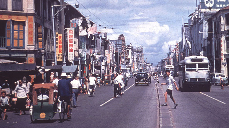 The bus on the right is likely a silver-coloured trolley bus operated by the Singapore Traction Company (STC); that company would merge with other companies to form today’s Singapore Bus Services (SBS) in the 1970s. Meanwhile, the trishaw operator on the left was perhaps unaware that the upcoming independence of Singapore would lead to rapid modernisation and the decline of his industry.