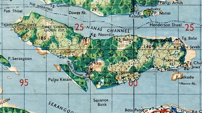 Did you know? The pictured map of Ubin dates back to 1945 and includes a reference to “Squance Bank” in the water between the island and the mainland. This bank remains today and is a popular fishing shoal for catching orangespotted grouper, barramundi and Spanish flag snapper.