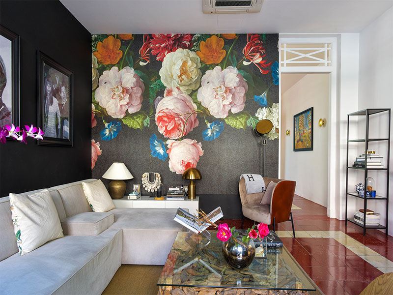 Opening the gate to an ultra-modern shophouse in Newton is a very petite, fit and beautiful woman. Maria-Rosa greets me with a warm hug, a kiss and an apology about drinking her smoothie. I instantly regret not making it to the gym that morning. As we walk into the lounge, which is straight off the entry courtyard, a wallpapered wall is the first thing I notice – large pink peonies on a black background. It’s bold and striking, and I love it (though I’m a bit freaked out at the bugs that are also depicted, larger than life, on the petals!).