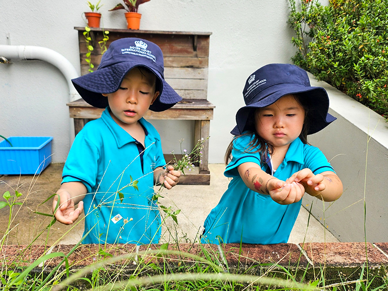 The DCIS green campus serves as an extension of the classroom, taking play-based learning outside. The children take nature walks to compare real plants and trees, then return to the classroom to refine their drawings. This activity helps them deepen their understanding of growth.