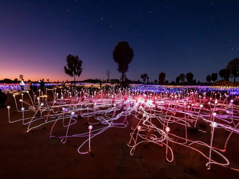 During your time around Uluru, you’ll be surprised to discover that when night falls, the desert doesn’t fade into darkness. Instead, the land transforms with Field of Light Uluru, a world-renowned art installation created by Bruce Munro. Stretching across more than seven football fields, it features 50,000 glowing spindles of light that sway gently. They also shift colours from ochre and violet to deep blue and white, mimicking the hues of the desert itself.