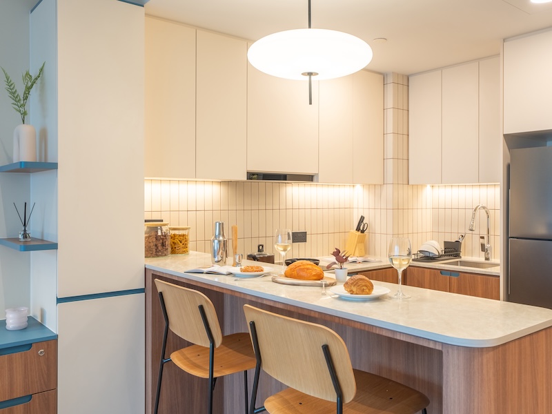 There’s also a range of useful shared spaces for all residents within the property. They include a lovely terrace area, state-of-the-art gym and fully-equipped shared kitchen and dining space. This private kitchen is also available to use for events, parties, and tastings. Plus, there’s a karaoke and TV room, theatre, yoga studio and entertainment room. These are great places to meet others and make friends.