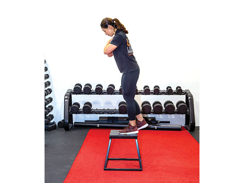 1. Begin with both feet placed firmly on a box. Start by stepping down with your right foot, only allowing the tip of your toes to lightly touch the ground.