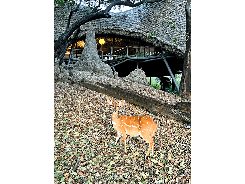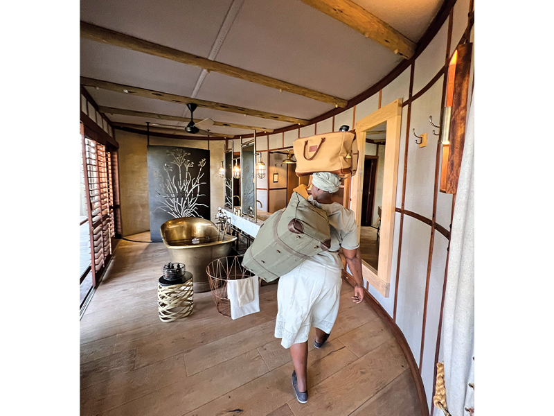 In fact, the entire lodge is elevated, creating a bird’s eye view of the meandering river below, where wildlife passes through, grazing and drinking. The new sustainable lodge was refurbished using synthetic materials that look like palm fronds for roofing, and with long-lasting supports and fire-retardant thatching. The design allows light into the buildings and panoramic views out. Slender sticks bound together create the awnings and dappled shade, effective in the heat of summer.
