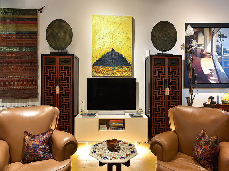 As we move from room to room, there are endless mementos of their life and travels – the home acts like a museum dedicated to their adventures. Where the house may lack large windows to the outside world, it generously makes up for it with ample wall spaces, which are a perfect canvas to display their incredible and eclectic art collection.