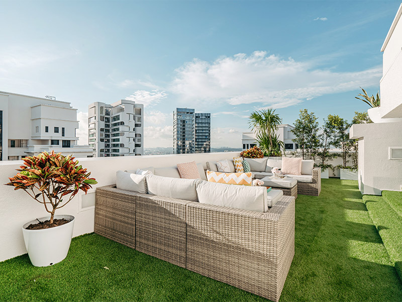 The many outdoor spaces of this Singapore penthouse are grounded in greenery, whether it’s artificial turf, potted plants or even urban vegetable beds. We created different entertaining areas for the clients, from private dining nooks and intimate armchair seating to large lounging spaces.