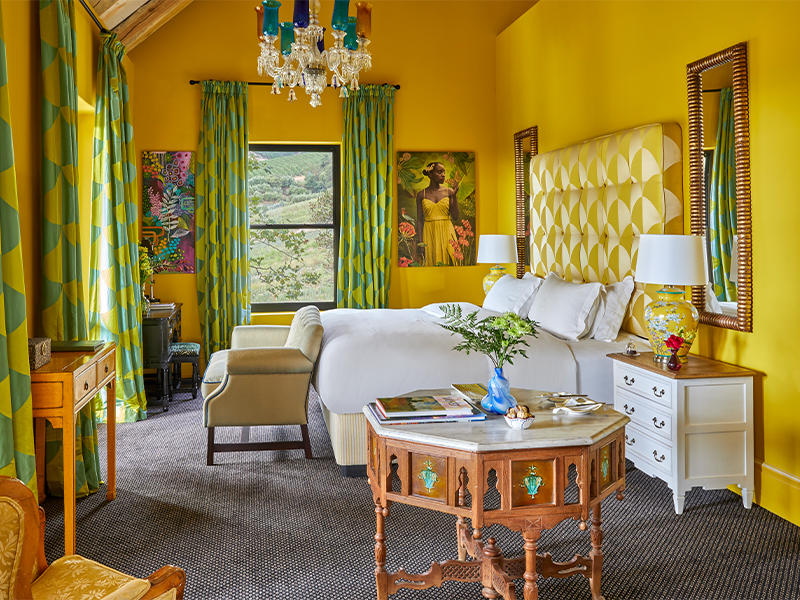 The six luxurious suites in the house are individually designed, blending remarkable fabric accents with décor sourced locally and abroad. Hand-embroidered and printed silks, tapestries and vintage items are all in the mix. Multiple outdoor patios and verandas provide intimate spaces to take in the views of vineyards and gardens, while the indoor games room is ideal for a casual game of billiards. The room’s relaxed vibe, seating and well-stocked bar create an inviting space for socialising with family or friends.