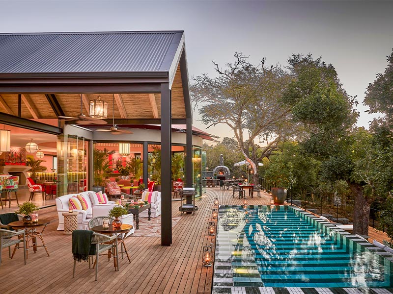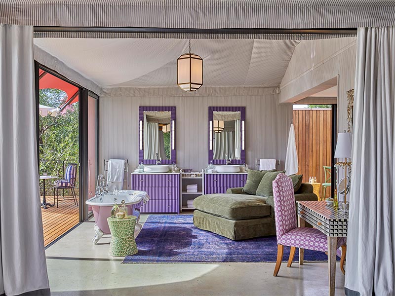 In addition to its luxury properties in and around Cape Town, The Royal Portfolio maintains a safari collection in the Greater Kruger National Park. There are four luxury lodges that make up Royal Malewane. Among the four is the latest addition, Masiya’s Camp, which has people talking about its extraordinary design and use of colour on a safari. The lodge is tucked into the vegetation of a game reserve, with salmon pink safari tents providing a sense of the theatrical. The enormous private suites here are individually decorated in an array of colours – green, blue, yellow, lilac and more.