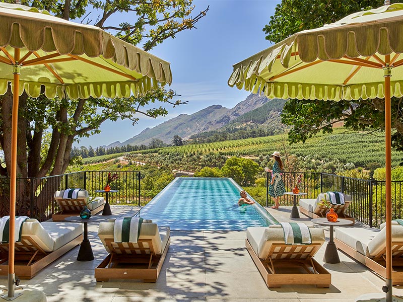 One accommodation option at La Residence is Franschhoek House, a huge exclusive-use villa built around a 200-year-old oak tree. It’s in a secluded setting, with a stunning raised pool and a sumptuous use of colour throughout.