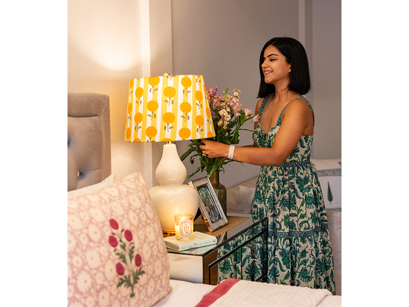 For furnishings, I like to keep a mix of traditional and modern, so you’ll see linen cushions and table runners, but also silk and more traditional things. I mostly source these from two of my favourite brands in India – Good Earth and Nicobar. I love printed fabrics, too – particularly Indian block print. So, I sourced fabrics from different places in India and refurbished some of my furniture. For example, our armchair from IKEA was upholstered with a marigold print cloth. Marigold is one of my favourite flowers and the print was love at first sight.
